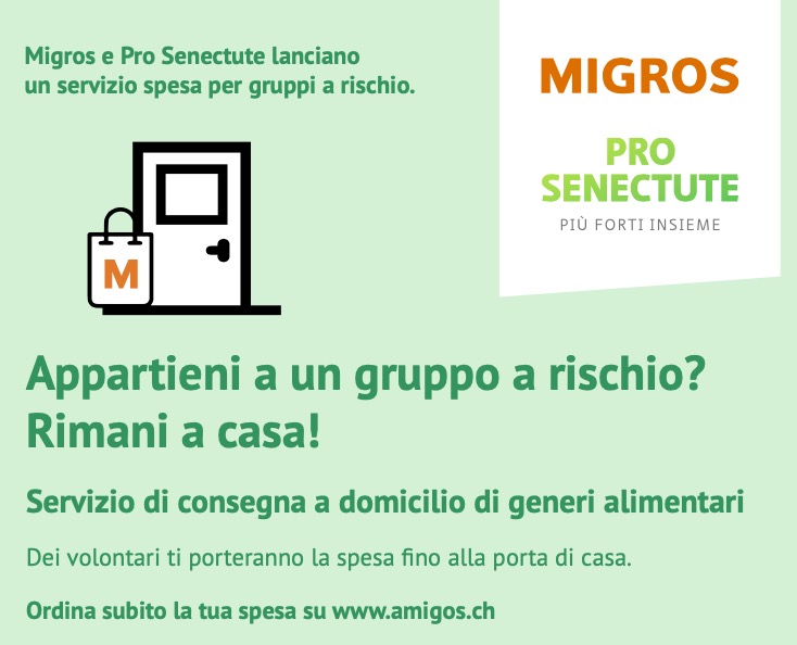 Migros avvia insieme a Pro Senectute una nuova forma di aiuto al vicinato e offre un servizio gratuito di consegna a domicilio dei generi alimentari. Il pagamento degli acquisti avviene senza contanti. Il servizio di aiuto al vicinato è gratuito. Gli acquirenti possono versare spontaneamente al loro «volontario» una mancia digitale.