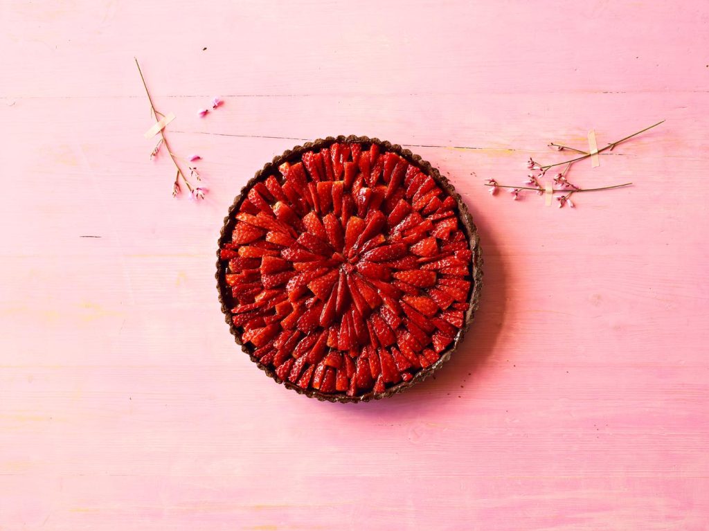 Ingredienti per 8 persone (pari a una tortiera di circa 30 cm Ø): burro e farina per la tortiera · legumi secchi per la cottura in bianco · 200 g di cioccolato fondente · 50 g di burro · 200 g di crème fraîche · 1 presa di fleur de sel · 500 g di fragole · 2 c di gelatina di fragole. Pasta al cacao: 180 g di farina · 1 presa di sale · 3 c di cacao in polvere · 50 g di zucchero di canna, semolato · 100 g di burro · 1 uovo.
