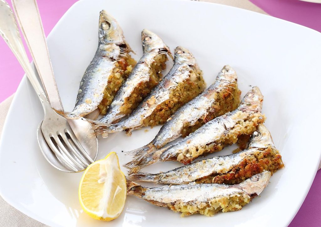 Ingredienti per 4 persone: 1 kg di sardine · frutta secca a piacere · 2 cipollotti · pane secco · 1 spicchio di aglio · prezzemolo · succo di limone · 20 g di burro · olio di oliva · sale e pepe.