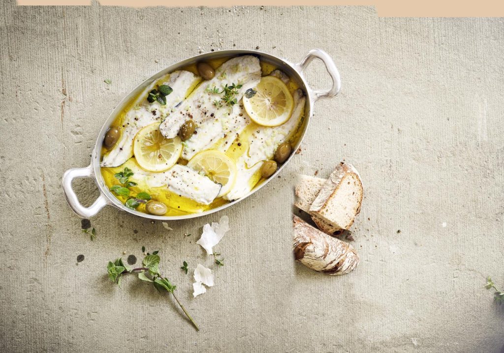 Ingredienti per 4 persone: 500 g di filetti di branzino o di orata · pepe dal macinapepe · 1 limone · ½ mazzetto d’erbe aromatiche miste, ad es. origano, timo · 2 spicchi d’aglio · 1 dl d’olio d’oliva · qualche oliva verde · fleur de sel.