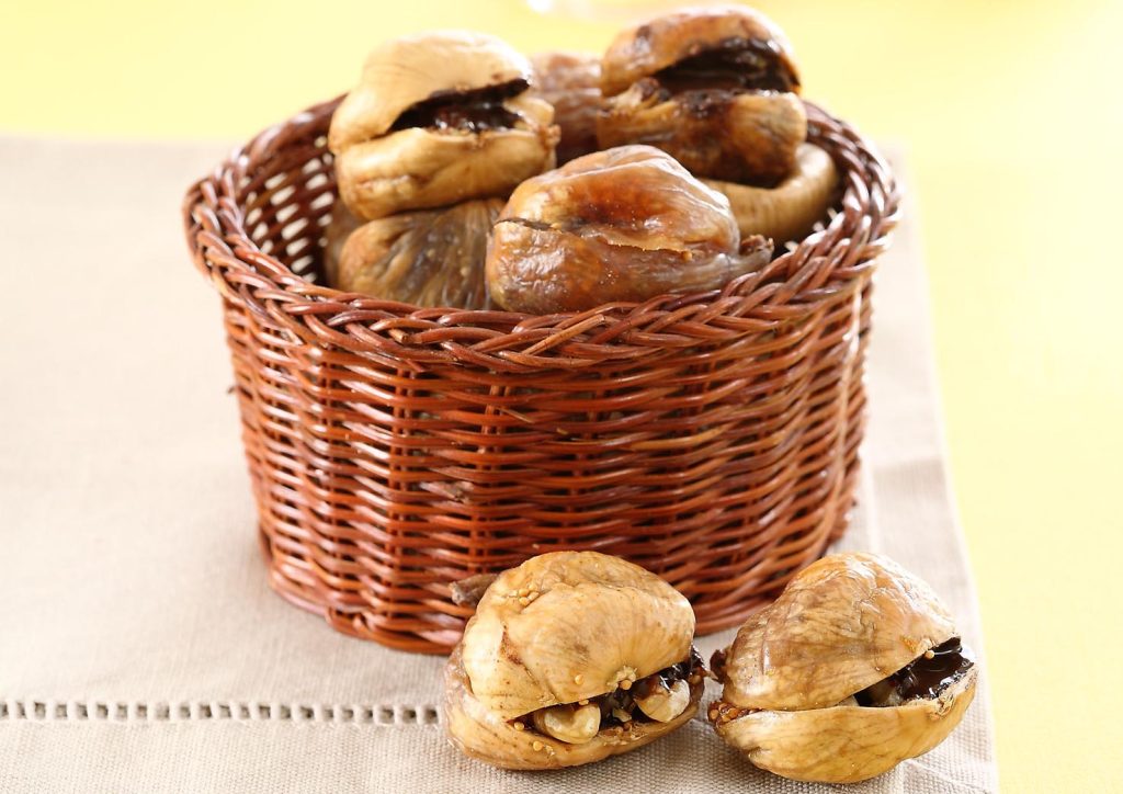 Ingredienti per 10 persone: 20 fichi secchi · 70 g di gherigli di noce · 70 g di mandorle spellate · 30 g di canditi · 30 g di cioccolato fondente · vino dolce · zucchero · cannella in polvere.