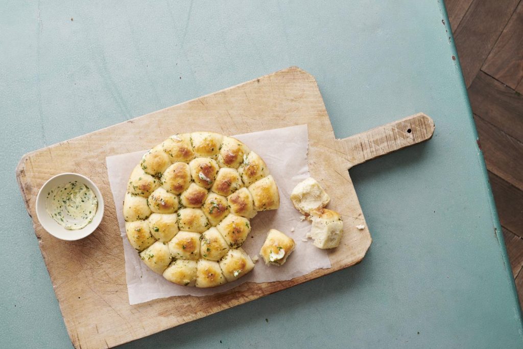 3. Scaldate il forno ventilato a 180 °C. Spennellate con cura le palline con 2/3 del burro all’aglio. Cuocete il pane in forno per 20-25 minuti. Sfornate e lasciate intiepidire. Distribuite il burro all’aglio restante sul pane e servitelo tiepido.
