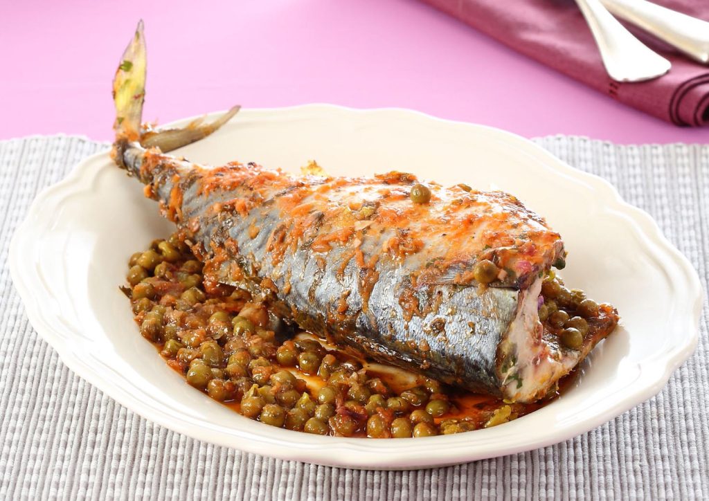 Ingredienti per 4 persone: 4 sgombri da 300 g l’uno · 400 g di piselli · 1 spicchio di aglio · 1 cipolla · concentrato di pomodoro · prezzemolo · vino bianco secco · olio di oliva · sale e pepe.