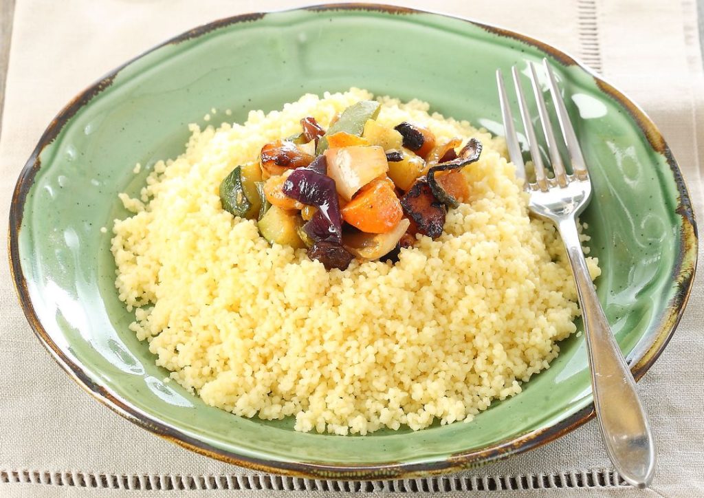 Preparate il cuscus seguendo le indicazioni riportate sulla confezione; versatelo in un piatto da portata, conditelo con burro o olio e servitelo con le verdure disposte al centro.