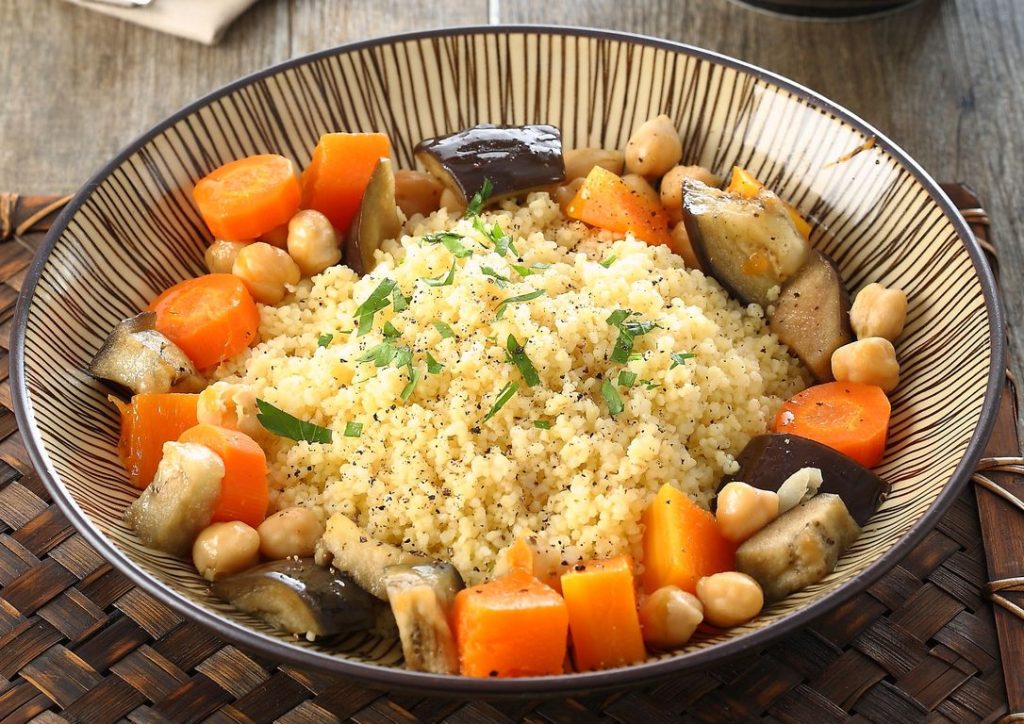Ingredienti per 4 o più persone: cuscus precotto g 400 · ceci cotti g 250 · verdure miste a piacere g 800 · curry · curcuma · coriandolo tritato · prezzemolo · olio di oliva · sale e pepe.