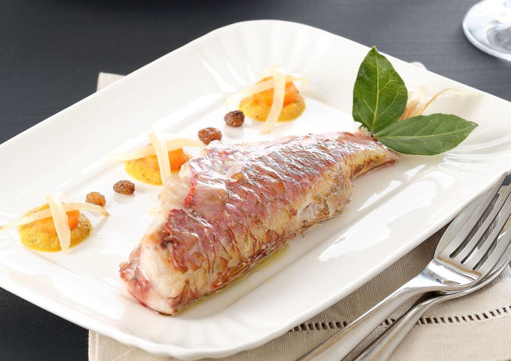 Ingredienti per 4 persone: 4 pagelli medi · uva passa · 2 porri · 1 carota · vino bianco secco · brodo di pesce · 1 foglia di alloro · uva passa olio di oliva · sale e pepe