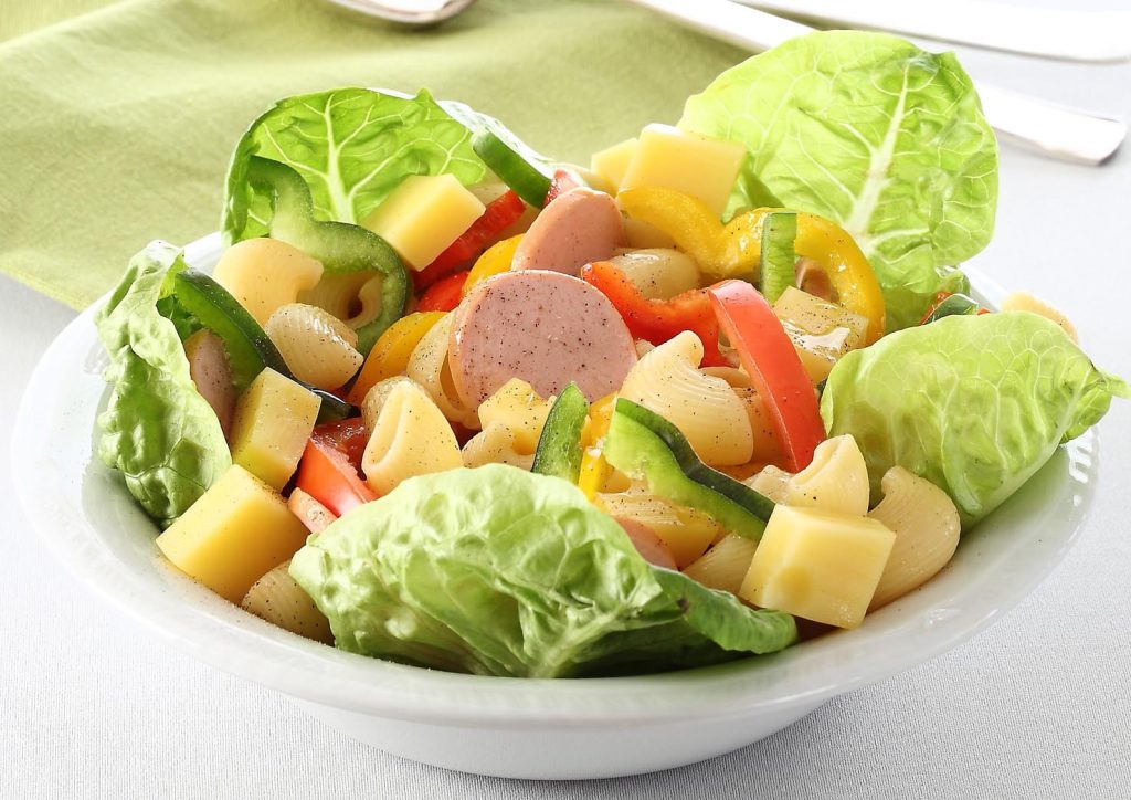 Ingredienti per 4 persone: 200 g di pasta a piacere · 2 peperoni · 1 wurst da circa 200 g · 100 g di emmental · lattuga · aceto a piacere · olio di oliva · sale e pepe.