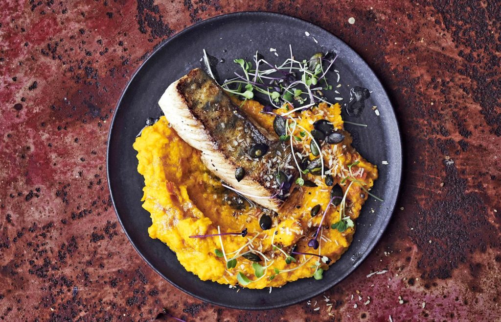 5. Servite la purea di zucca al cocco con i filetti di lucioperca e guarnite con la noce di cocco e i semi di zucca messi da parte. Cospargete con i microgreen.