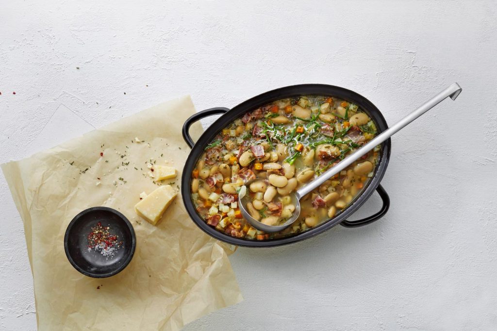 Ingredienti per 4 persone: 8 fette di pancetta · 2 spicchi d’aglio · 1 mazzetto di erbe aromatiche miste, ad esempio rosmarino, timo, salvia · 400 g di verdure per minestra, ad esempio sedano rapa, porro, carote, verza, cipolle · 2 c di burro · 1,2 l di brodo · 2 scatole di fagioli bianchi di Spagna · 30 g di parmigiano grattugiato · sale · pepe · 100 g di cavolo piuma.