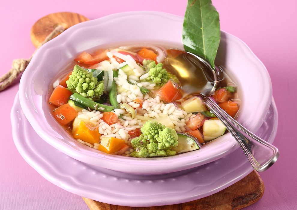 Ingredienti per 4 persone: riso da minestra g 200 · 1 cipolla · verdure a piacere g 400 · 2 foglie di alloro · olio di oliva · sale e pepe.