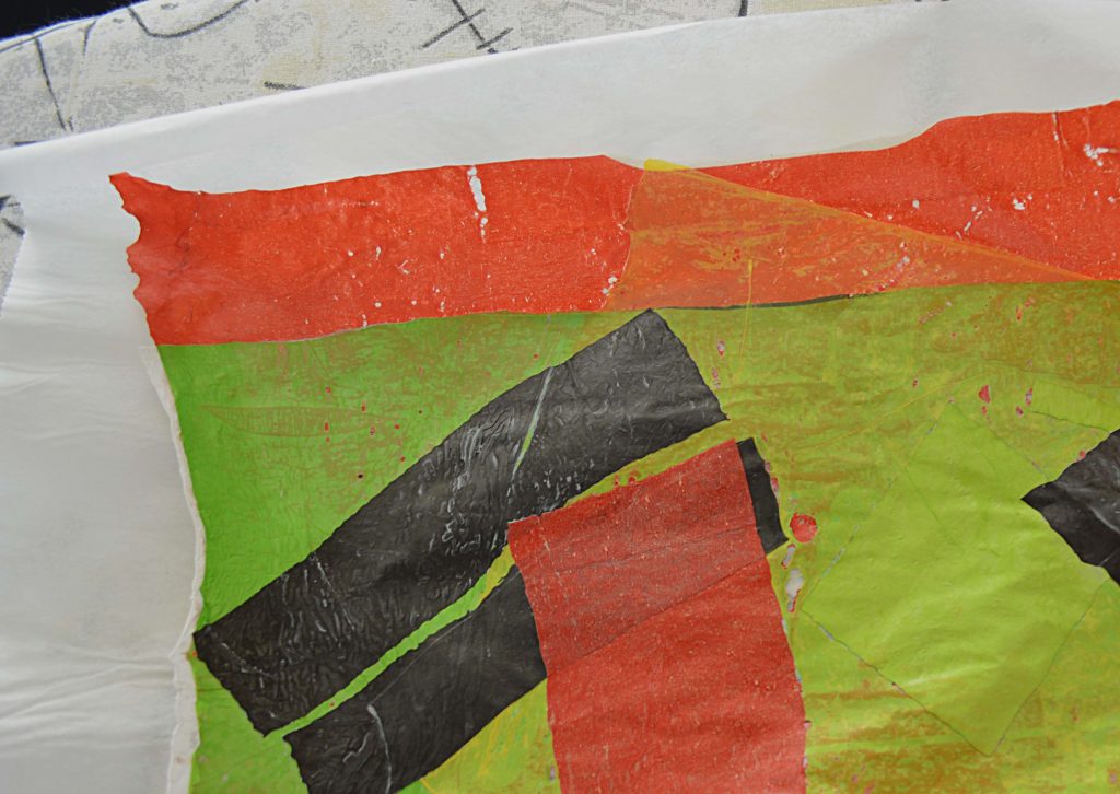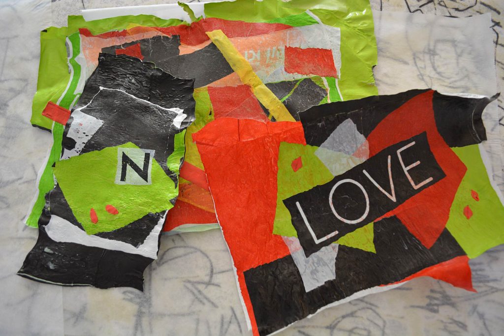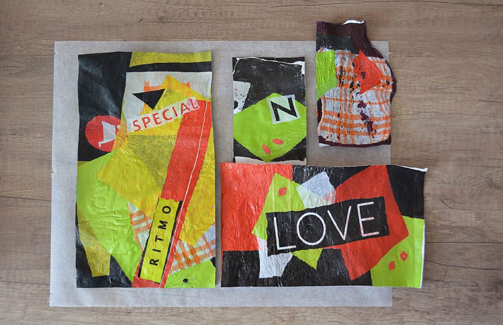 Guardate la vostra composizione e se volete aggiungete qualche lettera o scritta. In questo caso passate ancora una volta il ferro caldo (sempre proteggendo prima la composizione con la carta da forno) in modo che anche quest’ultime si uniscano all’insieme creato. A questo punto dovreste avere ottenuto dei fogli di plastica sufficientemente spessi, ma allo stesso tempo con una buona flessibilità (la consistenza dovrebbe sembrare a quella di una tela cerata). Con riga e taglierino regolate i bordi in modo da avere rettangoli regolari. I pezzi più piccoli potete incollarli su delle cartoline d’auguri 10x15cm (tagliate i rettangoli 8X13cm), con i pezzi più grandi potete realizzare delle semplici trousse.
