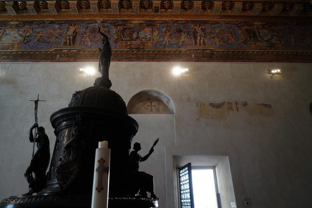 Finalmente arriviamo davvero a rivedere la luce del sole e prendiamo la strada che porta verso il Duomo e il Battistero. All’interno di quest’ultimo – al centro si erge la Fonte Battesimale in bronzo del XVII secolo ed è sovrastata dallo splendido soffitto a cassettoni con scene che rappresentano episodi della Bibbia – in una nicchia sul muro, quasi sopra la porta di ingresso, lassù in alto, si trova il disegno della croce rossa, il simbolo dei Templari, emersa dopo lavori di restauro. Mentre accanto, sulla facciata del Duomo, si trovano altri simboli del passato templare.