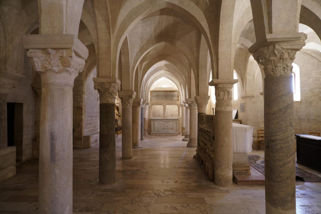 «In questa sala, che ha una particolare acustica, i templari si riunivano e cantavano per purificarsi» e mentre finisce di dire la frase, si mette al centro di uno degli scanni del perimetro della grotta e intona un canto profondo e baritonale, lo sguardo fisso verso la colonna. E in quel silenzio, il suono della voce sembra rimbalzare sulle pareti e arrivare al centro della cassa toracica. Ma forse la mia è solo suggestione.