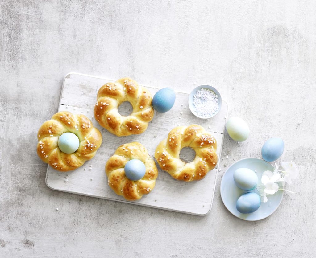 Ingredienti per circa 6 pezzi: 500 g di farina · 1 c di zucchero di canna · 1½ cc di sale · 20 g di lievito fresco · 3 dl di latte tiepido · 60 g di burro morbido · 1 uovo · farina per modellare · granella di zucchero per decorare · 6 uova sode colorate.