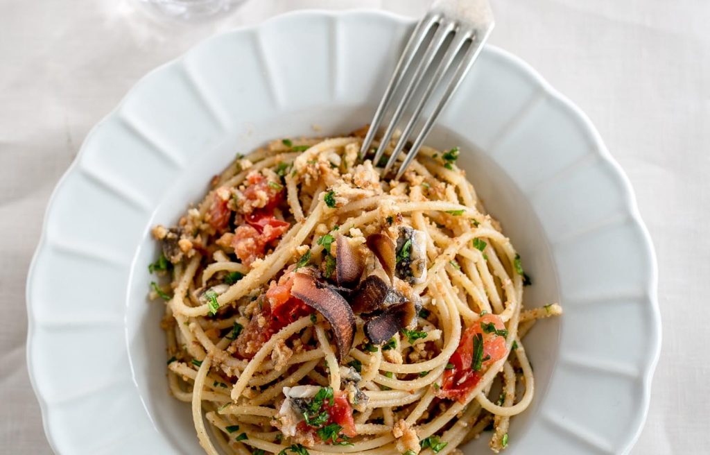 Ingredienti per 4 persone: 320 g di pasta a piacere · 200 g di alici già pulite · 150 g di pomodorini · aglio · prezzemolo · pangrattato tostato · olio di oliva · sale e pepe.
