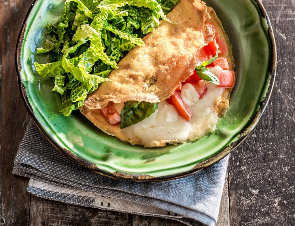 Ingredienti per 2 persone: 4 uova · 120 g di mozzarella · 2 pomodori medi · basilico · grana · burro · olio di oliva · sale e pepe.