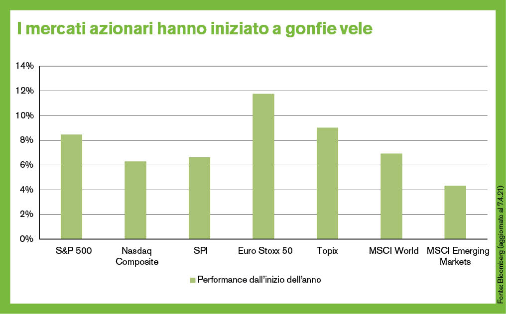 Grazie ai progressi compiuti nelle vaccinazioni e ai prevedibili allentamenti delle misure di protezione per contrastare il coronavirus, l’economia vivrà una fase di rilancio a livello globale nei prossimi mesi, crescendo quest’anno presumibilmente del 5% circa. Le imprese beneficeranno fortemente di questa dinamica di crescita e aumenteranno i loro profitti in modo significativo, il che conferirà ulteriore slancio ai mercati azionari.