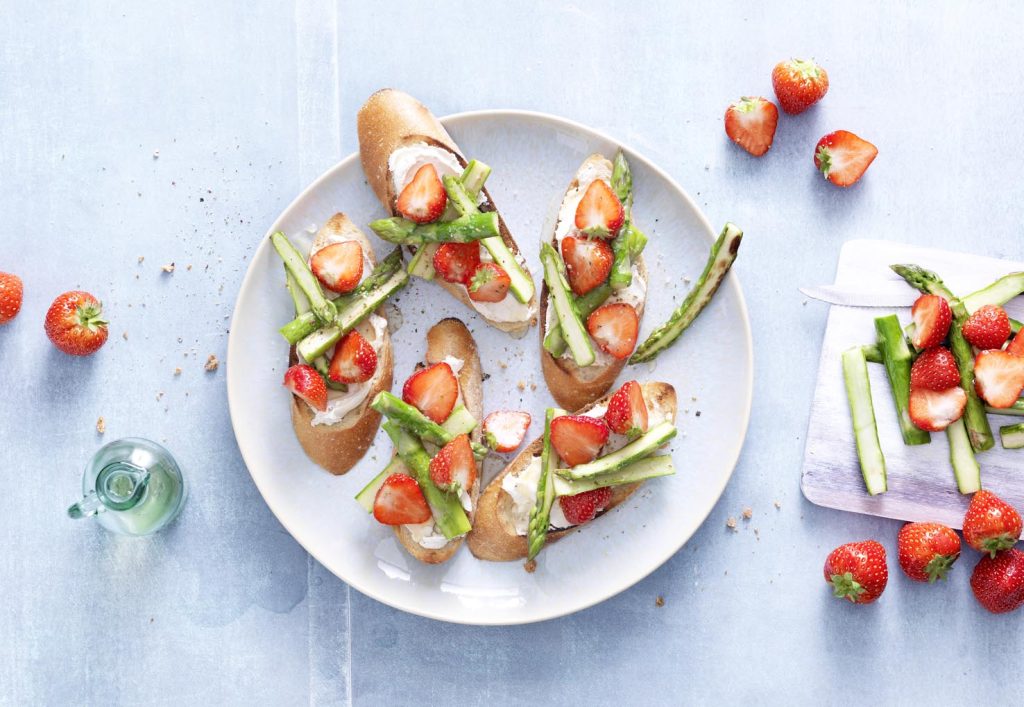 Ingredienti per 12 pezzi (1 teglia di 11×35 cm): 12 fette di pane di circa 10 g ciascuna, ad es. baguette del forno di pietra · 300 g d’asparagi verdi · 1 c d’olio di girasole · 250 g di fragole · 150 g di formaggio fresco al pepe, ad es. Cantadou ai 4 pepi · 3 c d’aceto di vino bianco · 3 cc di miele liquido · fleur de sel · pepe dal macinapepe.