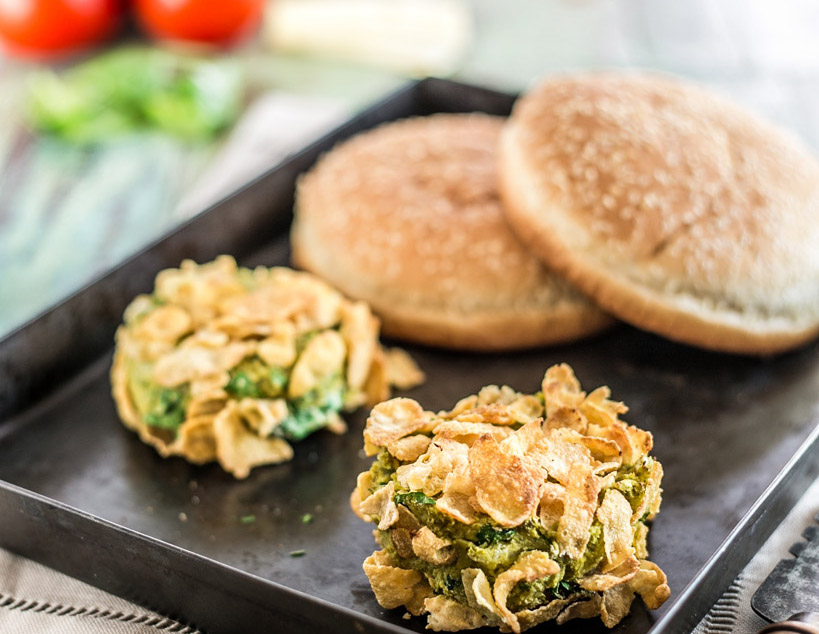 Ingredienti per 4 persone: piselli in scatola g 600 · patata lessa g 100 · corn flakes integrali g 150 · 1 spicchio di aglio · 1 cucchiaio di prezzemolo grattugiato · pane da hamburger · pomodori · 1 cucchiaio di farina di riso · olio di oliva · sale e pepe.