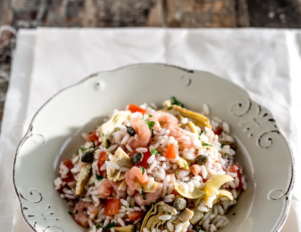 Ingredienti per 4 persone: 250 g di riso da insalata · 200 g di gamberetti sgusciati · 80 g di carciofi sott’olio · 2 cucchiai di capperi sott’aceto · 4 pomodorini · 1 cucchiaio di prezzemolo tritato · aceto di mele · olio extra vergine d’oliva · sale e pepe.