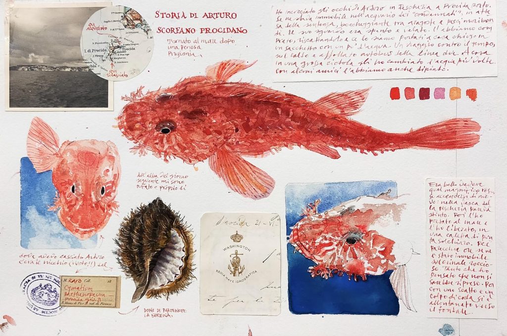 Mai però questo surrogato d’immortalità mi è parso tanto inadeguato. Così ho pensato a un risarcimento un po’ meno virtuale e sono andato in pescheria. Non speravo di riscattare una tartaruga naturalmente, ma sapevo che qualcosa avrei trovato nella «vasca dei condannati». Lì i miei occhi hanno incrociato quelli tristi (tristi!) di uno scorfano in attesa della sentenza, boccheggiante tra aragoste e qualche pesce moribondo. Ecco lo scorfano Arturo − mi sono detto − il pesce con il quale s’identificava il protagonista del romanzo della Morante. L’ho comprato e chiuso in un sacchetto con un po’ d’acqua; a casa gli ho cambiato l’acqua più volte. L’ho anche dipinto, naturalmente, ed era bello vedere quel magnifico rosso accendersi di nuovo, laddove nella vasca della pescheria pareva stinto. Infine l’ho portato al mare e l’ho liberato. Per parecchie ore è rimasto immobile sul crinale roccioso, tanto che ho pensato che non si sarebbe ripreso. Poi con uno scatto e un colpo di coda si è allontanato verso il fondale.
