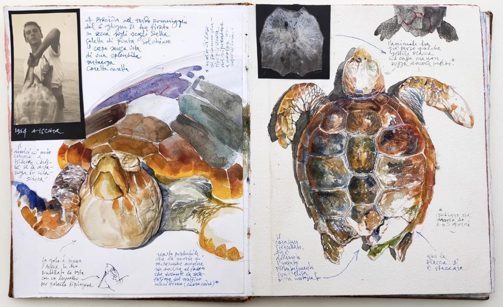 Quest’estate però la gioia del primo bagno nella caletta di Punta Solchiaro, con le sue acque oltremarine e all’orizzonte il profilo tormentato di Capri, è stata offuscata dall’incontro con il cadavere di una bellissima tartaruga marina. Ci sono animali la cui estrema rarità ne rende l’avvistamento un’esperienza memorabile. È appunto il caso della tartaruga Caretta caretta, fortemente minacciata e anzi prossima all’estinzione in tutto il Mediterraneo. Tanto più doloroso è stato dunque incontrare quell’animale barbaramente straziato dall’elica di una barca. Ho tirato in secca la tartaruga e l’ho disegnata. È il mio modo di procrastinare l’inevitabile scomparsa delle cose che amo, di sottrarle al fluire del tempo, conservandone la memoria in un’immagine.