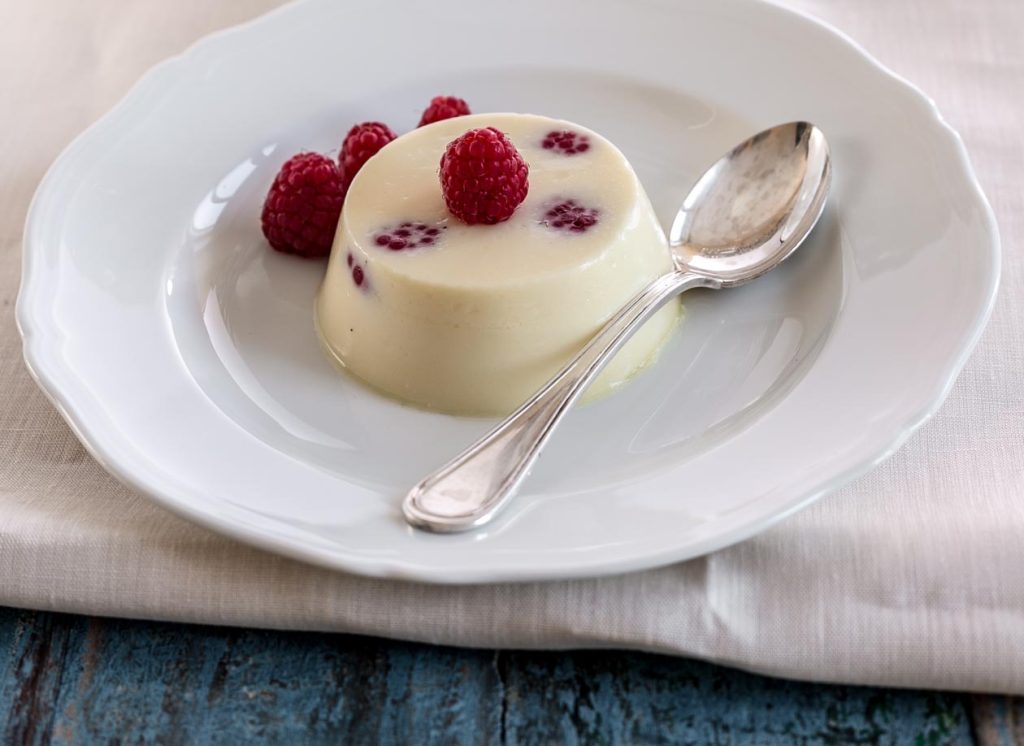 Ingredienti per 6 bavaresi: 200 dl latte · 2 tuorli d’uovo · ½ cucchiaino di vaniglia in polvere · 100 g di zucchero · 1 cucchiaino di maizena · ½ bacca di vaniglia · 4 g di gelatina · 170 g di cioccolato bianco · 250 g di panna · 1 pizzico di sale · 125 g di lamponi.