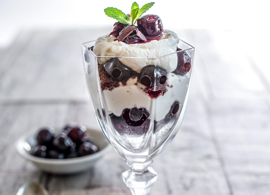 Ingredienti per 6 coppe: 200 g di ciliegie sotto sciroppo denocciolate · 4 cucchiai di kirsch · 200 g di pan di Spagna al cacao · 400 g di panna · 40 g di zucchero · scaglie di cioccolato o riccioli.