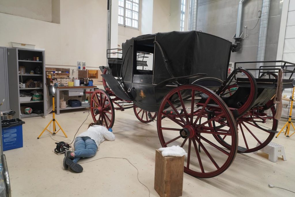 Continuo a entrare e a uscire dai vari laboratori e quando entro in quello degli arredi lignei, vedo una ragazza stesa a terra che sistema gli ultimi dettagli di una vecchia carrozza, adesso completamente rimessa a nuovo, appartenuta a Re Umberto I e ora di proprietà del Quirinale. Al piano superiore, docenti e studenti lavorano su una grande vetrata del 1600, «aggiustando» vetri colorati e metalli rovinati. Nel salone accanto, un immenso arazzo sdraiato su un tavolo viene controllato, studiato e analizzato, per poi procedere al restauro.