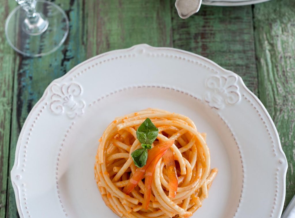 Ingredienti per 4 persone: 320 g di bucatini (o spaghettoni) · 6 peperoni rossi · basilico · ½ cucchiaino di zucchero · pasta di acciughe · olio di oliva · sale.