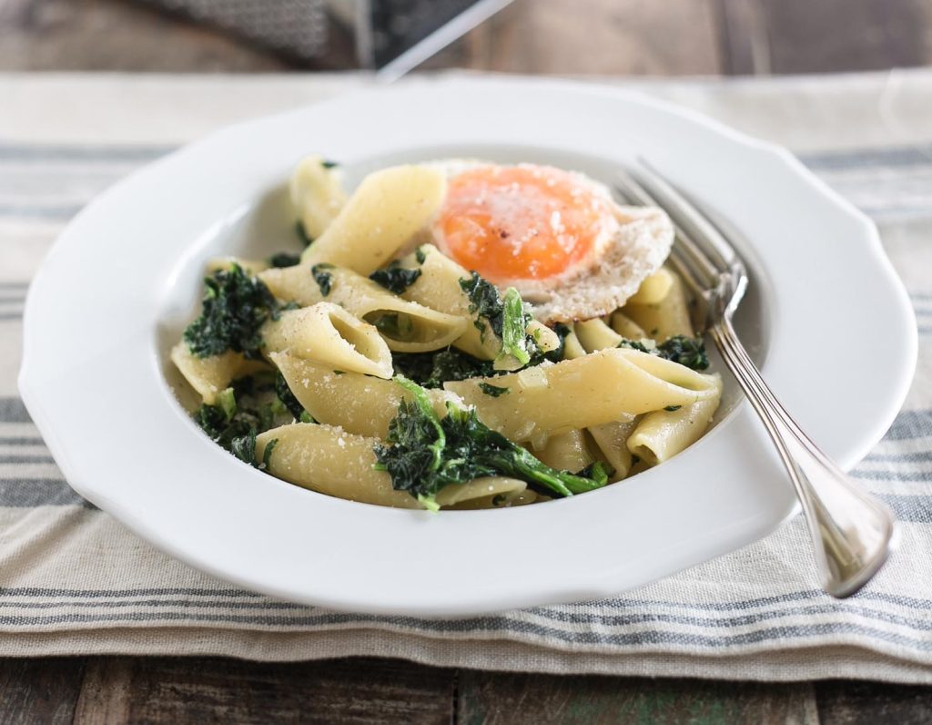 Ingredienti per 4 persone: 320 g di pasta corta con formato a piacere · 200 g di spinaci lessati al dente · 4 uova · 1 cipolla · 1 porro · 60 g di pecorino romano grattugiato o grana · burro · olio di oliva · sale e pepe.