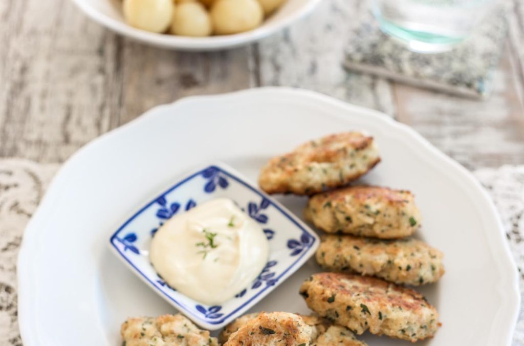 Spezzettate il pane e mettetelo in una ciotola. Versate il latte tiepido e lasciate che il pane lo assorba. Mettete in una casseruola 2 dita di acqua leggermente salata e acidulata con poco succo di limone. Cuocete il pesce per 4 minuti e raffreddatelo leggermente. Nel bicchiere del frullatore mettete la polpa di pesce lessata, il pane ben strizzato e il burro morbido. Frullate a intermittenza. Versate il composto nella ciotola e unite una buona presa di sale, il prezzemolo, l’uovo leggermente battuto e la noce moscata. Impastate: se l’impasto dovesse risultare troppo morbido unitevi poca farina bianca. Modellate le polpette di forma ovale e schiacciatele leggermente. In una padella scaldate l’olio, mettetevi le polpette e fatele dorare su entrambi i lati. Ponetele su un piatto da portata caldo e servitele immediatamente, nappate con la maionese. Accompagnate con patate novelle cotte a vapore.