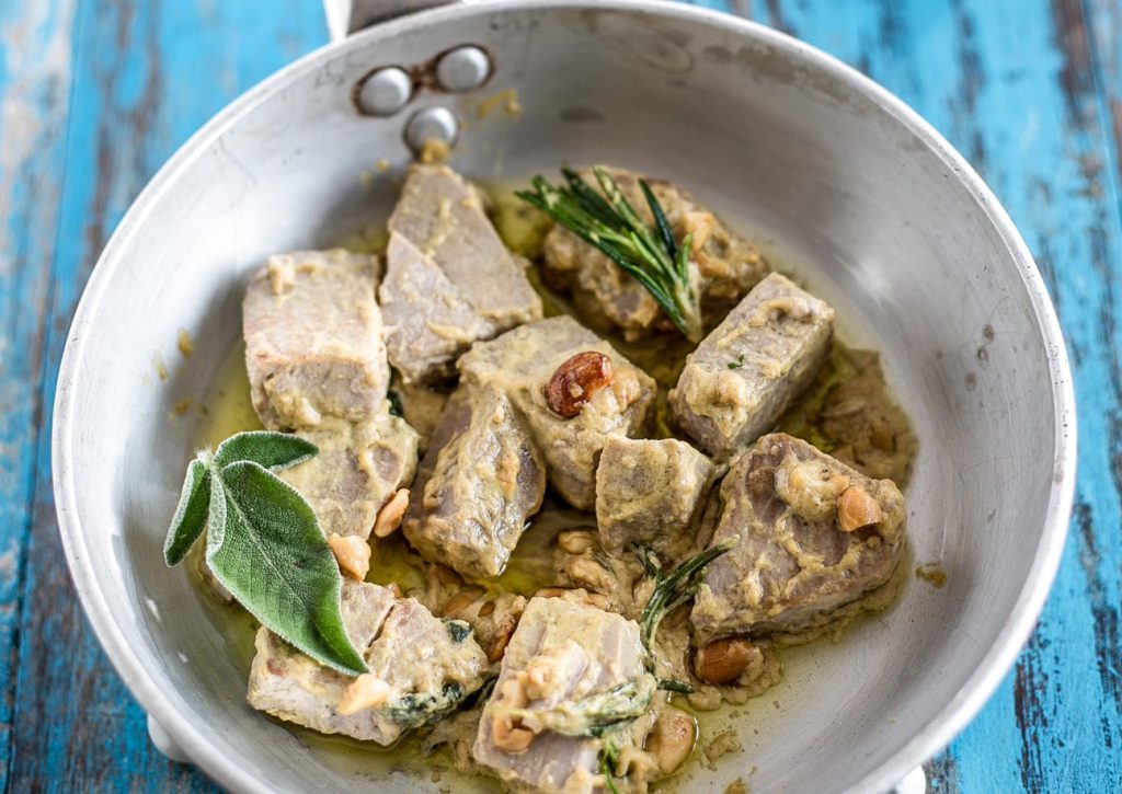 Ingredienti per 4 persone: 2 tranci di tonno da 200 g ognuno · 4 cucchiai di senape dolce · 1 cucchiaio di arachidi tostate tritate · 1 spicchio di aglio · 1 rametto di rosmarino · prezzemolo · foglie di salvia · vino bianco · succo di limone · olio di oliva · sale e pepe.