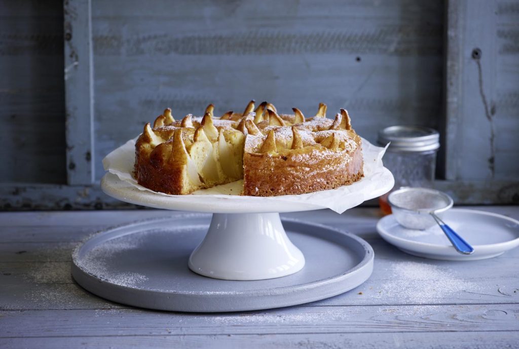 Ingredienti per 4 persone: 80 g d’amaretti secchi · burro per la tortiera · 150 g di burro, morbido · 100 g di zucchero · 1 presa di sale · 4 uova · 220 g di farina · 2 cc di lievito in polvere · 4 piccole pere (circa 600 g) · ½ limone · 3 c di gelatina di pere o di mele cotogne
