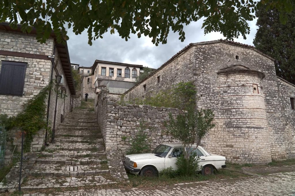 Mi incammino sulla strada ripida che attraversa il quartiere storico di Magalemi e arriva fino alla porta del castello dove un suonatore di tamburi in abito locale accoglie i turisti: pochi euro per farsi una foto insieme. Il castello di Berat è sicuramente l’attrattiva principale di questo luogo sospeso nel tempo: l’agglomerato di stradine e case in pietra ancora oggi ospita un centinaio di persone che qui vivono circondate da antiche rovine, monumenti, ristoranti.