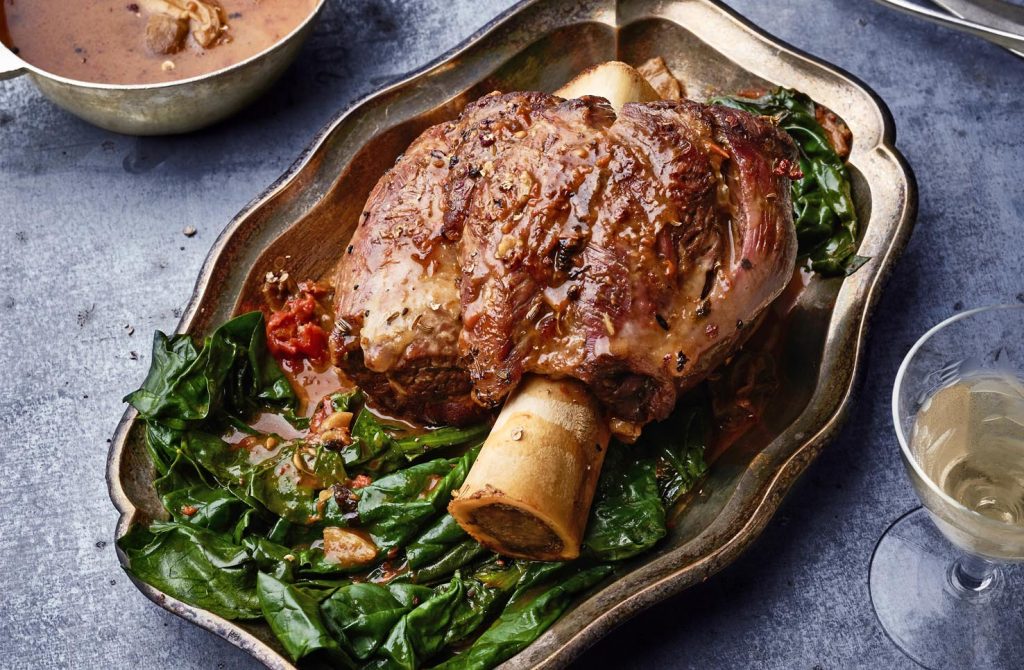 Ingredienti per 4 persone: 1 stinco di vitello di circa 1,3 kg, ordinabile in anticipo dal macellaio Migros, 30 g di porcini secchi, sale, pepe, 4 spicchi d’aglio, 5 c d’olio di girasole, 1 c di semi di finocchio, 2 dl di vino bianco, 4 dl di fondo bruno, 80 g di pomodori cherry semi secchi, 200 g di spinaci