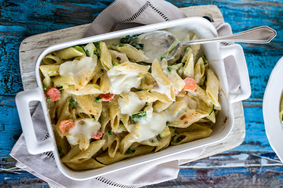 Ingredienti per 4 persone: pasta corta formato a piacere g 320 – besciamella g 200 – formaggio tipo crescenza g 100 – 1 porro – 2 zucchine – 2 carote – pisellini decongelati g 80 – latte – grana grattugiato – olio di oliva – sale e pepe.