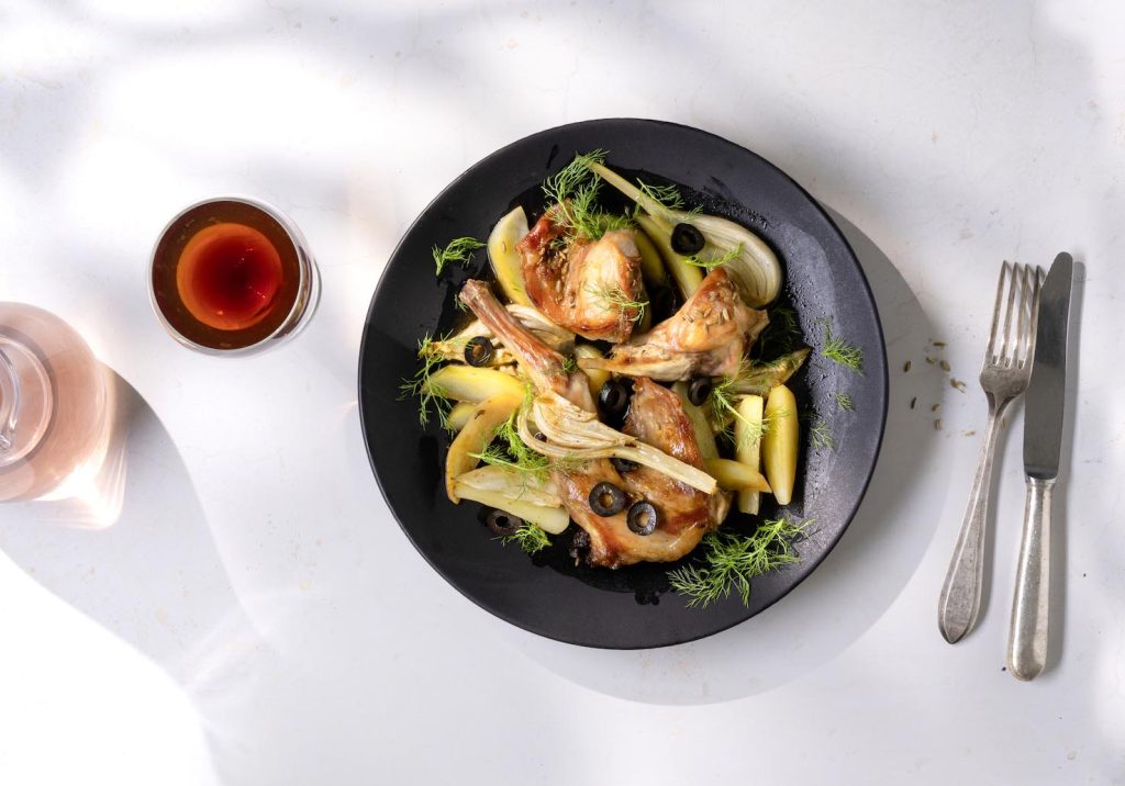 Ingredienti per 4 persone: 1,2 kg di coniglio a pezzi; sale; pepe; 4 c d’olio d’oliva; 2 c di semi di finocchio; 6 spicchi d’aglio; 2 dl di vino bianco; 1 finocchio con i ciuffi verdi di circa 250 g; 400 g di patate resistenti alla cottura; 2 c di olive nere snocciolate
