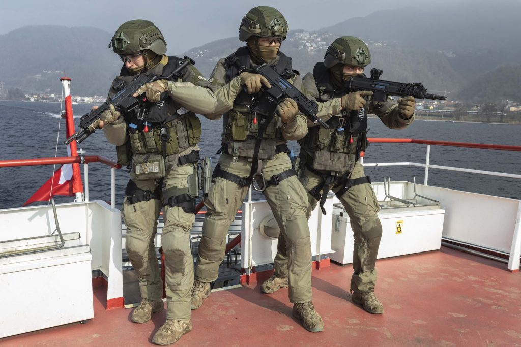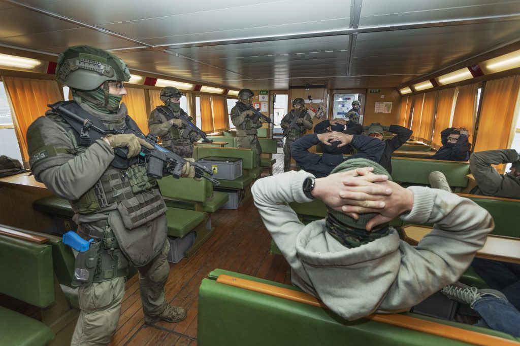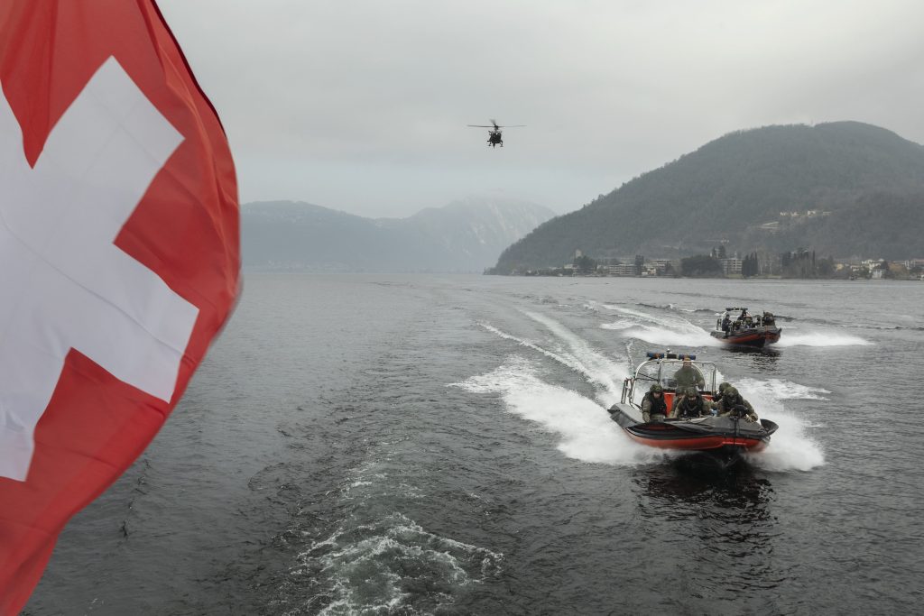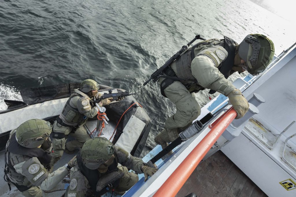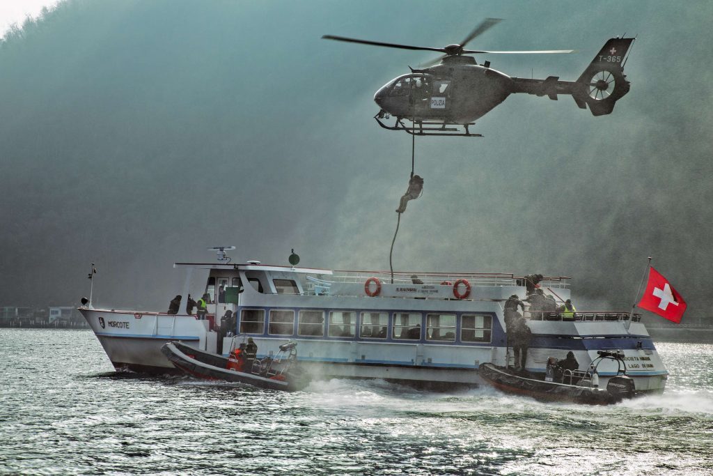Portati dall’elicottero che sorvola in perpendicolare il battello, gli agenti di polizia si calano lungo una corda per assicurare il ponte superiore della barca, mentre altre due squadre a bordo di gommoni accostano il Morcote intervenendo dalla poppa e guadagnando il ponte inferiore con apposite scale.