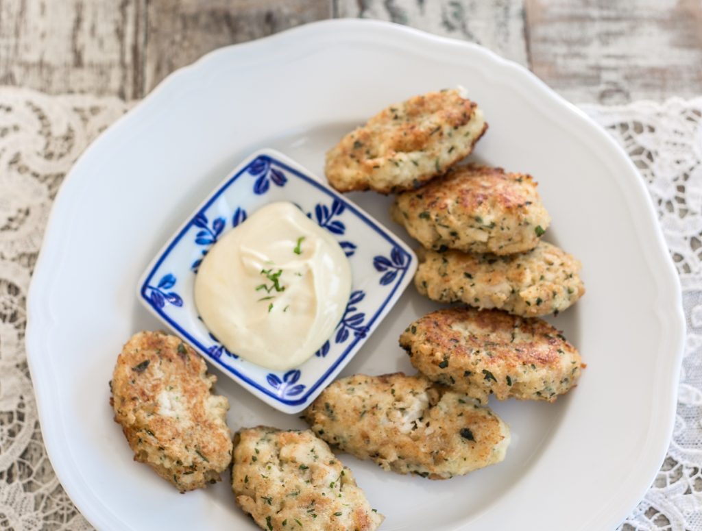 Ingredienti per 4 persone: 350 g di polpa di merluzzo – 150 g di mollica di pane – yogurt intero – senape – 1 uovo – prezzemolo tritato – noce moscata – 1 bicchiere di latte – 50 g di burro morbido – olio per friggere – sale.