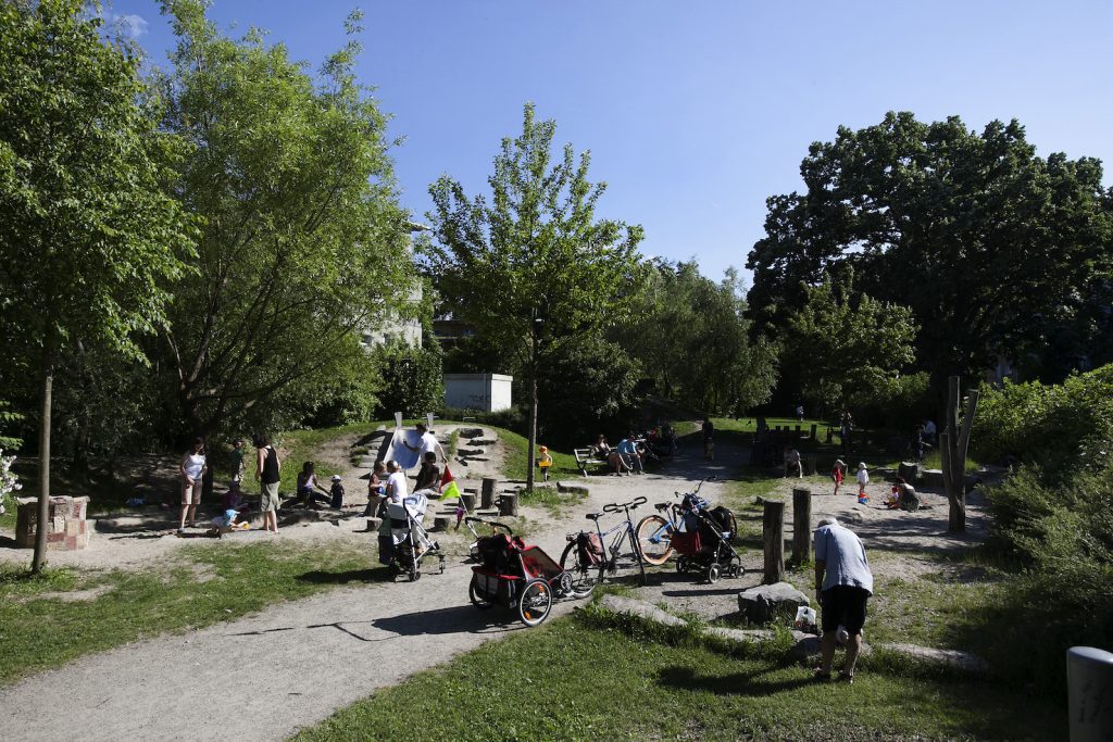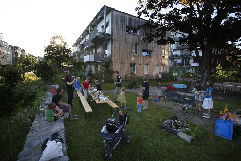Mentre cammino lungo uno dei percorsi pedonali, mi arrivano le voci di una festa di compleanno. Diverse famiglie sono riunite nel giardino e condividono lo spazio verde. I bambini a piedi scalzi corrono liberi e sereni, si rotolano per terra. «Per noi è importante che i nostri figli abbiano un contatto fisico con la natura che li circonda, devono toccare la terra, l’erba, le piante. E imparare sin da piccoli che si può vivere bene rispettando il pianeta», mi spiegano Annelene e Nik, una giovane coppia che vive qui da più di tre anni, mentre il loro neonato gattona sul prato. Seguendo la ciclabile si arriva alla periferia del quartiere dove ci sono piccole fattorie oltre le quali iniziano i boschi.