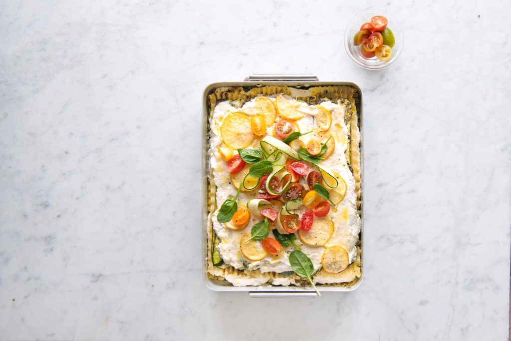 2. Scaldate il forno statico a 180 °C. Tagliate le zucchine per il lungo a fette spesse circa 3 mm. In una pirofila distribuite a strati le lasagnette, le zucchine e la ricotta con un po’ di pesto. Terminate con la ricotta.