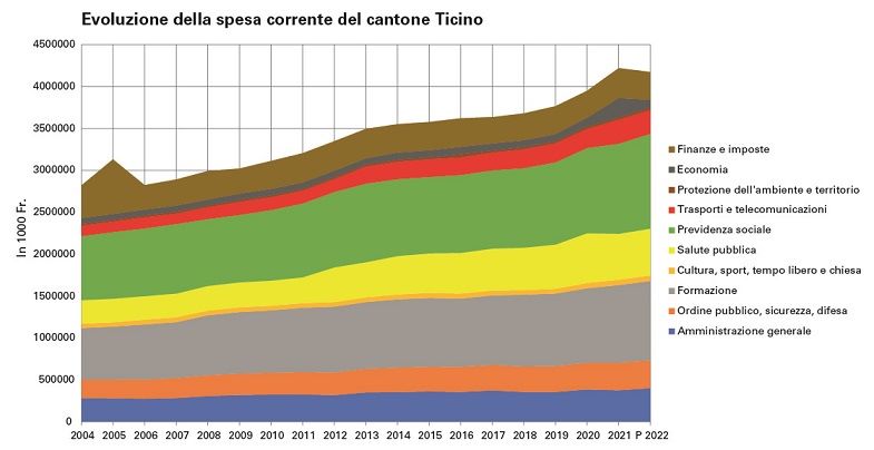 Nel 2021 su un volume complessivo della spesa corrente che ha raggiunto circa 4,2 miliardi di franchi, quasi i due terzi, pari a circa 2,5 miliardi di franchi, sono stati imputati ai settori della previdenza sociale (25,5%), della salute pubblica (13%) e della formazione (21,9%). I restanti 1,7 miliardi sono stati attribuiti agli altri settori, tra i quali primeggiano quello dell’amministrazione generale (8,9%), delle finanze e imposte (8,4%) e dell’ordine pubblico, sicurezza e difesa (7,8%). I trasporti e le comunicazioni, con un’incidenza del 6,8%, si collocano nel drappello di coda delle spese «minori», insieme all’economia (5,5%), alla cultura, tempo libero e sport (2%) e alla protezione dell’ambiente e del territorio (0,6%). La spesa per la mobilità e le telecomunicazioni ammontava così nel 2021 a circa 288 milioni di franchi, di cui circa 120 milioni, ossia il 42%, sono stati destinati a indennizzare le imprese di trasporto per i costi non coperti dei servizi erogati.
