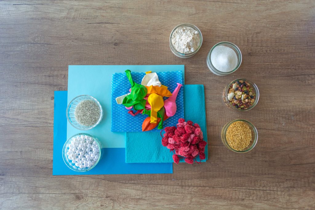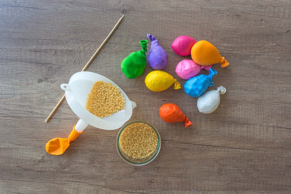 Selezionate i materiali da utilizzare quindi riempite i vari palloncini. Per facilitare questa operazione potete utilizzare un imbuto oppure un cono di carta e aiutarvi con uno stecchino di legno. Una volta riempiti i palloncini annodateli in modo che il materiale non fuoriesca.