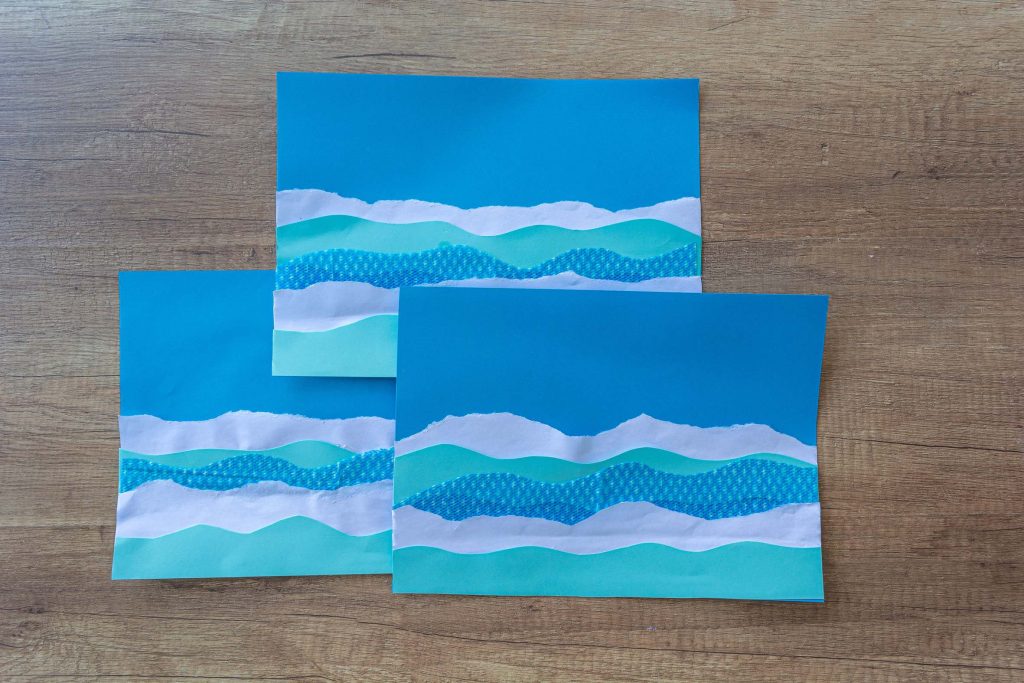 Con il pennarello indelebile disegnate la bocca del pesciolino, incollate l’occhietto semovibile, e aggiungete una piccola pinna (ricavata dal panno o dai panni multiuso) completate con un nastro in prossimità del nodo (facoltativo). Prendete 3 cartoncini blu e con la tecnica del collage create sulla metà inferiore le onde del mare incollando varie strisce di cartoncini/panni/carta nelle tonalità del mare.
