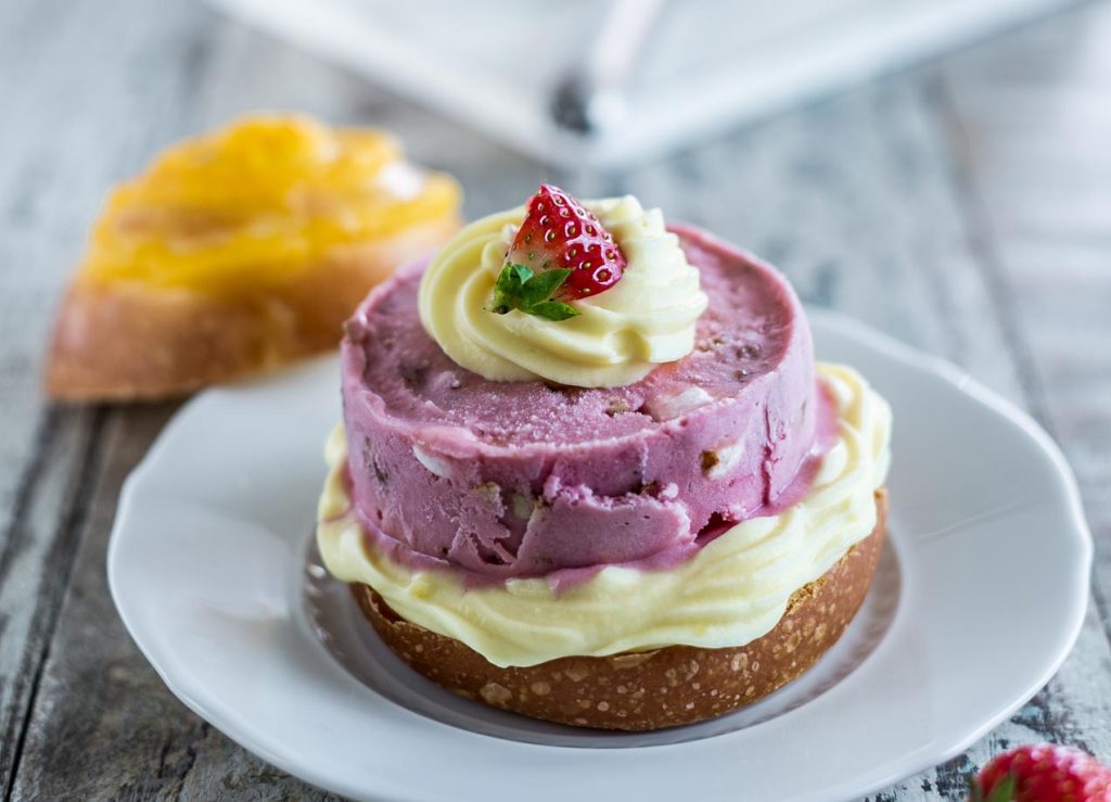Ingredienti per 4 persone: 4 brioche rotonde tipo veneziane, 300 g di gelato di frutta a piacere, 100 g di mandorle pralinate, 80 g di marshmallow, 70 g di panna, 70 g di crema pasticciera pronta