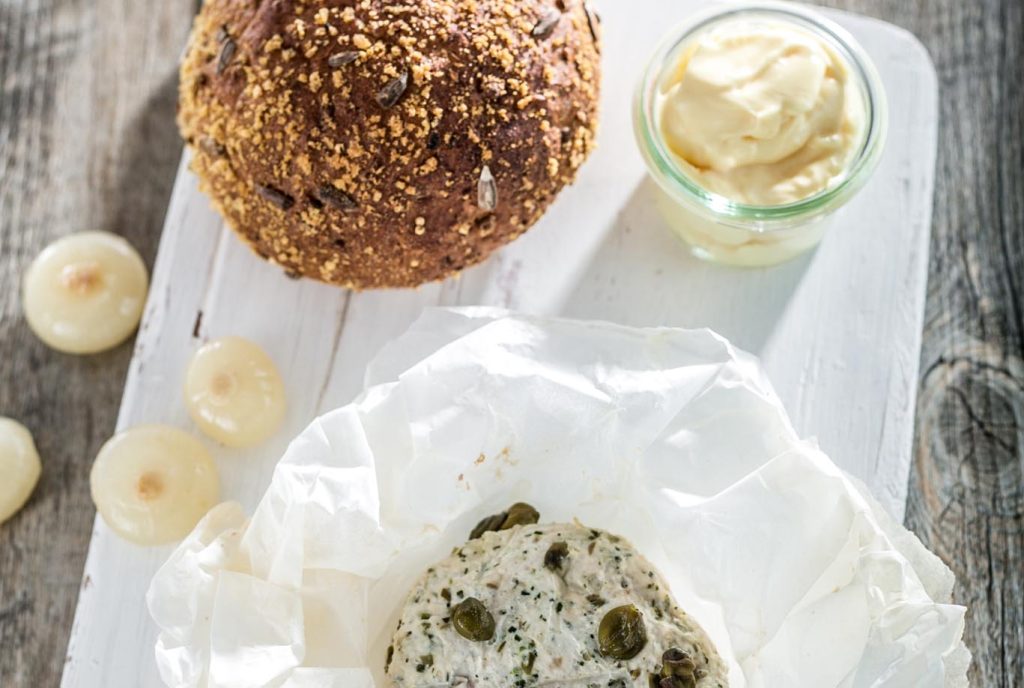 Ingredienti per 4 persone: 500 g di polpa di cosce di pollo disossate, tritata o tagliata al coltello, 80 g di polpa di patata lessa ben calda, 1 manciata di olive nere, 1 porro, 1 cucchiaio di prezzemolo, 1 cucchiaio di capperi tritati, pane da hamburger, cipolline sott’olio, insalata a piacere, olio, sale e pepe