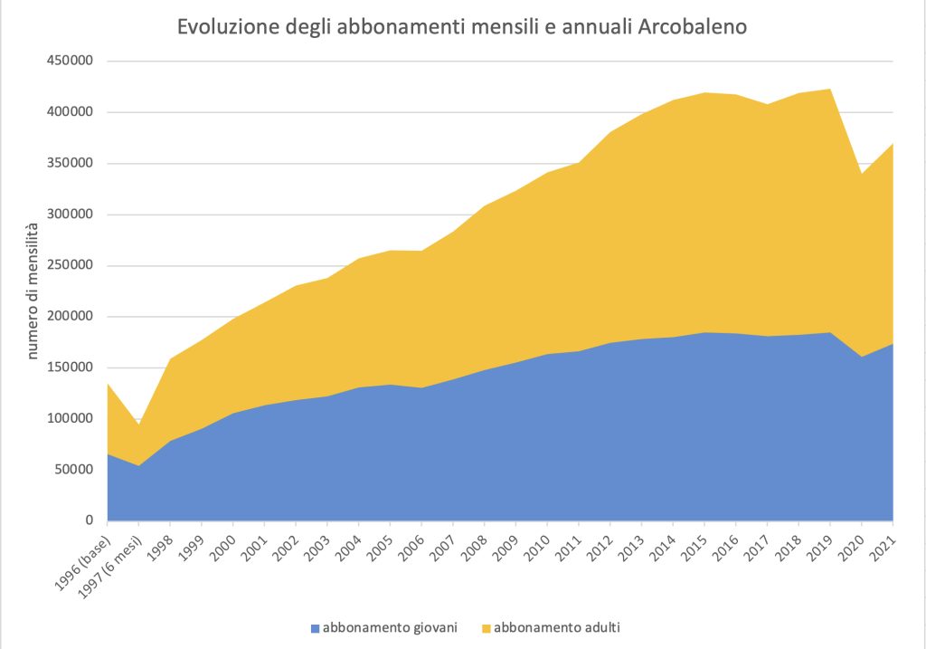 Arcobaleno compie nel 2022 il suo venticinquesimo compleanno. Quello che oggi sembra scontato ha tuttavia dovuto superare non poche difficoltà, di cui sono stato testimone in qualità di funzionario cantonale. L’iniziativa assunta dal Cantone appariva sospetta a talune imprese di trasporto. Qualcuno temeva di dover abdicare alle proprie competenze e di trovarsi disarmato di fronte a perdite di introiti. Alcuni Comuni hanno perorato l’allargamento dei perimetri delle zone per ampliare i propri vantaggi ricorrendo perfino contro la decisione finale del Consiglio di Stato, che doveva a sua volta garantire il finanziamento del progetto. Dal profilo tecnico, inoltre, le esperienze acquisite erano ancora sporadiche. Agli inizi degli anni ’90 le Comunità tariffali in Svizzera si contavano infatti sulle dita di una mano, oggi sono oltre venti. Tutto ciò ha potuto essere superato. Il principio che per progredire occorresse unirsi ha fatto breccia nelle imprese, i Comuni hanno riconosciuto che l’elasticità dei confini di zona ha dei limiti e hanno aderito ad un adeguato sostegno finanziario mentre il Governo prima e il Parlamento poi hanno riconosciuto al settore dei trasporti pubblici una dignità nell’ambito della politica della mobilità che era allora ancora del tutto embrionale. Oggi il costo delle agevolazioni tariffali ammonta a circa 13 milioni di franchi all’anno, ripartito a metà tra Cantone e Comuni. Gli utenti infine hanno accolto la riforma tariffale con molto favore. Il numero delle mensilità vendute nella forma di abbonamenti mensili e annuali è quasi triplicato e la quota di utenti-adulti ha ormai superato il 50%. Nel 2019 erano mediamente in circolazione quasi 49’000 abbonamenti. La corsa al rialzo si è arrestata solo nel 2020 con l’esplodere della pandemia da Coronavirus per poi dare nell’anno successivo un segnale di ripresa. Il recupero prosegue anche nei primi mesi del 2022, grazie anche a una offerta di servizi che dal 2021 ha conosciuto un potenziamento generale in corrispondenza dell’apertura della galleria di base del Ceneri.