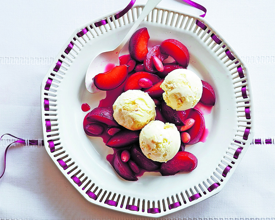 250 g di gelato, ad esempio al fior di latte o alla crème fraîche, 60 g di amaretti morbidi, 500 g di prugne o susine, 30 g di mandorle intere spellate, 1 dl di sciroppo, ad esempio cranberry o bacche