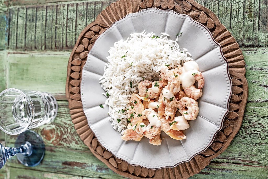 Ingredienti per 4 persone: 16 o più code sgusciate di gamberi – 6 scalogni – panna acida g 150 o più – 1 spicchio di aglio – erba cipollina – 2 cucchiaini di curry in pasta – olio di oliva o di semi – sale.